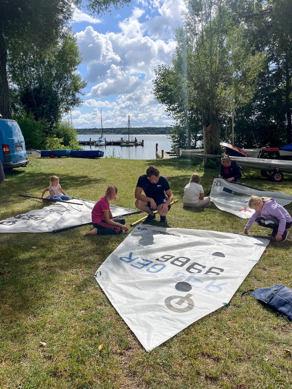 Insgesamt waren 5 Vereine (Ribnitz, Parchim, Plau, Rechlin, Röbel) vertreten mit einer Rekordzahl von 45 Kindern. Die ersten 2 Tage waren mit reichlich Wind ausgestattet was einen guten Einstieg ins Trainingslager bat. Jeden Morgen gab es eine Runde Frühsport mit anschließendem Schwimmen in der doch schon sehr kalten Müritz, gefolgt von 2 Trainingseinheiten Segeln oder Theorie je nach Wind Gegebenheiten.