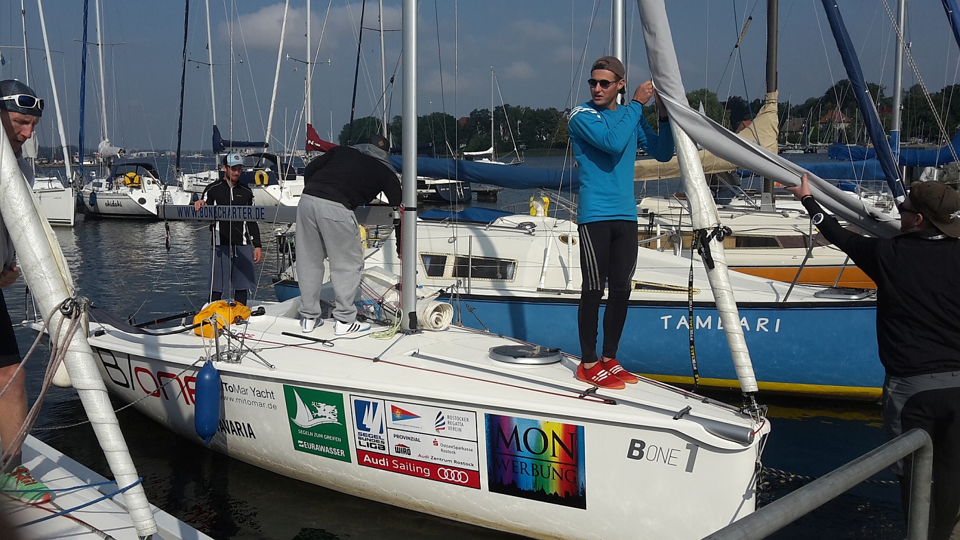 in Rostock, um das ambitionierte Ziel 'Aufstieg in die zweite Segelbundesliga' zielstrebig anzugehen. Samstag. 8.30Uhr in der Früh. Bei ausgiebigem Frühstück und jeder Menge Motivation im Gepäck besprachen Konrad, Max, Ole, Carsten, Maria, Bernward, Michael, Timo und ich die Trainingsziele der nächsten beiden Tage. Frisch gestärkt waren im Rostocker Stadthafen zwei Bavaria B/one schnell aufgetakelt. So wurden vormittags Grundlagen- und Gewichtstrimm sowie Positionsgebundene Abläufe erlernt, um das nötige Bootsgefühl entwickeln zu können. Nachmittags, mittlerweile vor der beeindruckenden Kulisse des Warnemünder Strands, definierten wir bei umlaufenden Positionswechseln Wenden, Halsen und eine Vielzahl taktischer Variationen der Genackermanöver. So bekam ein jeder das nötige Gespür für den Aktionsraum- und ablauf des Nebenmanns und Ungereimtheiten konnten ausgebessert sowie flüssige Handgriffe verfeinert werden. Nach über sieben Wasserstunden reflektierten wir am Alten Strom in Warnemünde das Erlernte bei gemütlichem Abendessen und gingen müde aber zufrieden mit dem Trainingstag schlafen. Am Sonntag galt es, die einstudierten Manöver vom Vortag zu festigen und viele kurze Rennen in Form von Up&Down-Kursen zu fahren, wie sie in der Liga auch gefahren werden. Die Wind- und Wetterbedingungen hätten besser nicht sein können. Bei konstanten 12-16 Knoten Wind und Sonnenschein über das ganze Wochenende konnten wir uns nicht beklagen. So konnten wir am Sonntag Abend ein effektives Trainingswochende resümieren und blicken freudig auf das Müritz Match Race in Waren am ersten Oktober-Wochenende, bei dem auch ein Großteil des Ligateams teilnimmt und welches als Generalprobe für die Qualifikation in der Woche darauf gesehen werden kann. Einen großen Dank an Carsten, der das Wochenende organisiert und den Trainingsplan erstellt hat. Ein weiter Dank aller Teilnemer an den Verein, welcher die Charterung der Boote übernahm. Ich wünsche allen Vereinsmitgliedern einen schönen Saisonausklang und hoffe, den einen oder anderen bei den restlichen Veranstaltungen noch zu sehen. Goodewind - Ahoi! Fabian