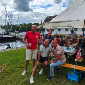 ... der Feier mussten wir um gutes Wetter bangen. Es zogen immer wieder kleine und große Regenschauer durchs Revier, doch rechtzeitig zum Mitgliedertreffen im „Alten Hafen“ bekamen wir Kaiserwetter. Thomas hatte nicht nur das Wetter gut organisiert!Barbara und Uwe hatten sich in diesem Jahr bereit erklärt das Treffen zu gestalten. Neben dem Schmücken der Tische gab es für jeden eine Infokarte und ein Namensschild. So konnten hier Namen, Rezepte, Urlaubsziele etc. ausgetauscht und festgehalten werden. Des Weiteren spendierten sie dem Verein eine Großkaffeemaschine, die zu einer wesentlichen Erleichterung beitrug. Danke Euch!Zum guten Wetter gab es dann noch ein Kuchenbuffet das die Erwartungen aller bei weitem übertroffen hat. An dieser Stelle ganz besonderer Dank an unsere Kuchenbäcker! Unter unserem Segelzelt, dass am Vortag von emsigen Helfern aufgebaut worden war, begannen wir am Nachmittag mit Kaffee und Kuchen.Aufgrund des warmen Wetters wechselte man in einem fließenden Übergang vom Kaffee zum Kaltgetränk und vom Bienenstich oder der „Schwarzwälder Kirsch“ zur Bratwurst oder Nacken. Hier gab es zum Gegrillten ein Potpourri an mitgebrachten Salaten, Saucen und Broten. Zum Enden der Veranstaltung konnte man in 70 zufriedene Gesichter blicken.Es hat allen gefallen. Diese Veranstaltung war ein voller Erfolg. Danke an alle Helfer! Mit seglerischen Grüßen Holger S.